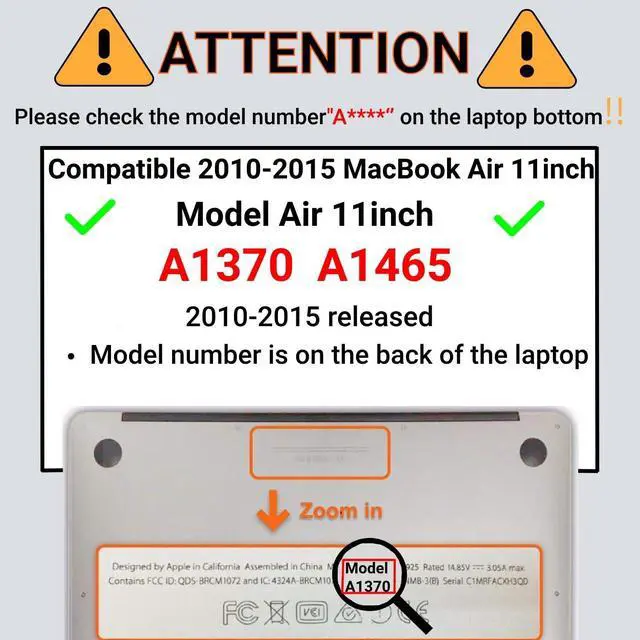 How to order the correct size protective case for your Macbook? Please check your Macbook model "AXXXX" at the back of the laptop. "XXXX" are numerical numbers. According to your Macbook model, please choose the same model at the size section. Model number location map is available at the picture section ^^ COMPATIBILITY - This case is only compatible with Model A1370/A1465 (Macbook Air 11", Release 2010-2015). Macbook Air 11" refers to the laptop display screen diagonal length is 11" or 11.6". Not the length of laptop. You can check Macbook model differentiation diagram at the picture section ^^ DIMENSION -