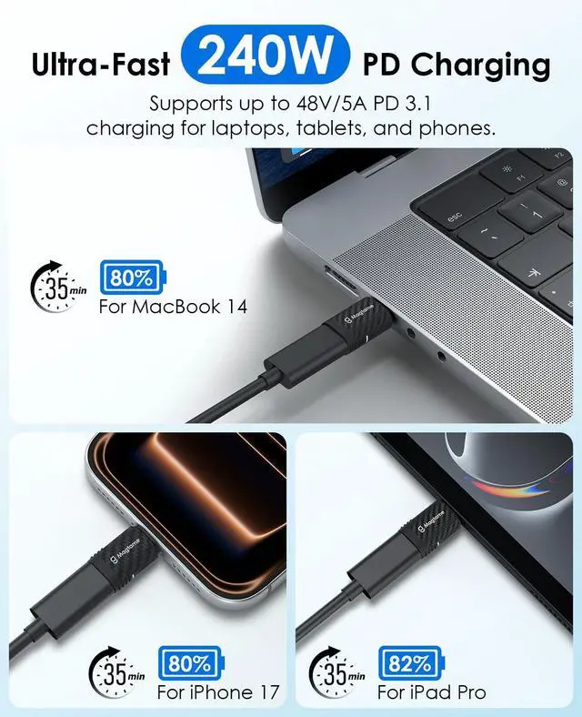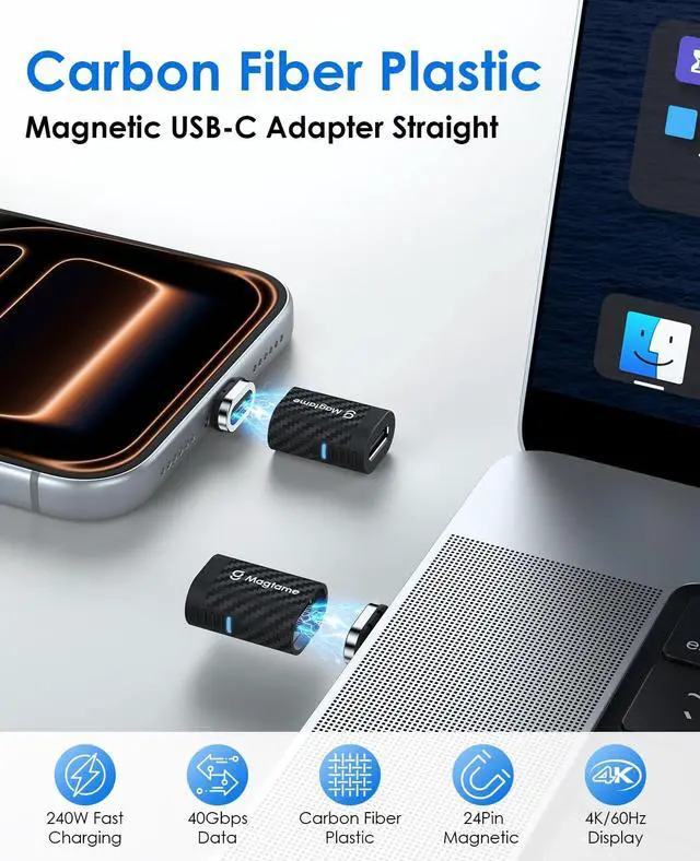 Premium Carbon Fiber Plastic Shell: The magnetic USB C adapter features a durable plastic carbon fiber housing for superior heat dissipation, scratch resistance, and a sleek texture. It keeps your device looking premium while protecting the port from daily wear and tear. ^^ 240W