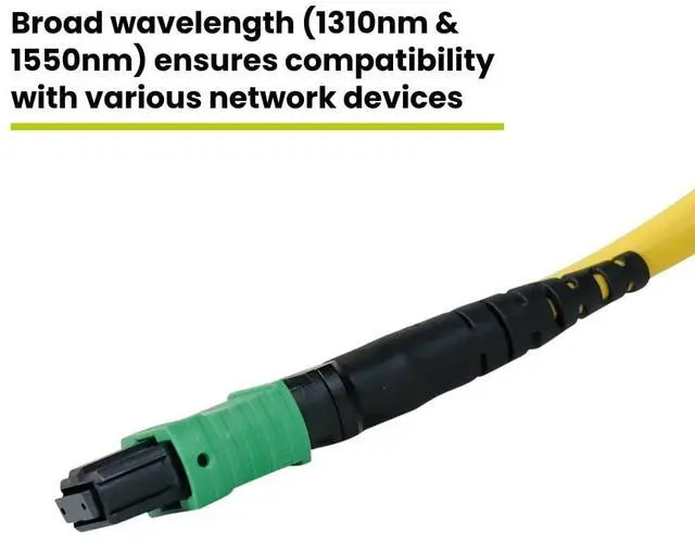 Perfect fiber patch cable for QSFP+ 40G SR4/CSR4, 100G QSFP28SR4, and compatible 400G DR4 links. MTP12 supports MTP8 systems. ^^ [Durable] 10 mm minimum bend radius and 3.0 mm OD jacket fit tight routes and highdensity racks. Aramid yarn reinforced core fiber resists stress during installs. Rugged single mode fiber optic Ethernet cable for demanding environments. ^^ [Field Tested, Customer Approved] Performance tested and compliant with ANSI/TIA 568.2 -E. Certified to IEC 61300-3-35, IEC-61754-7, and TIA-604-5. UL Listed. Backed by our superior customer support.