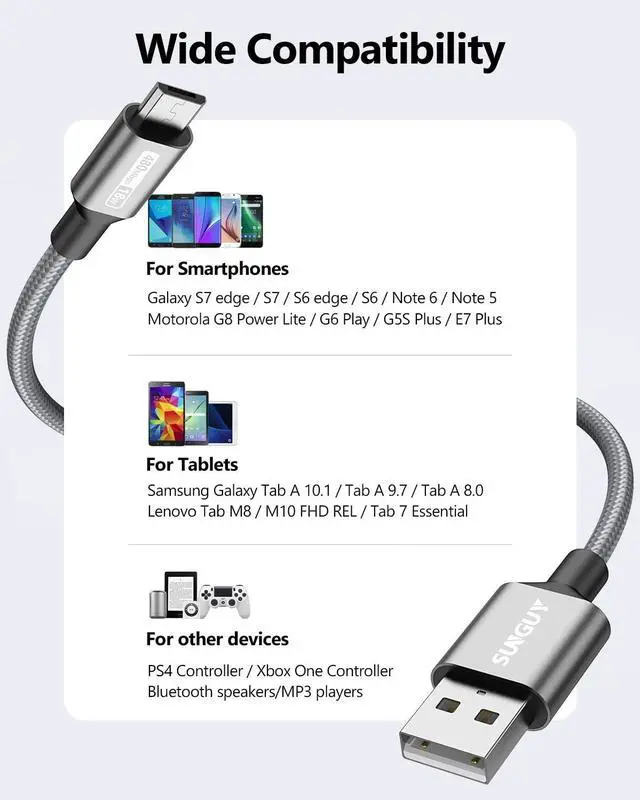 ^^ Wide Compatibility: Compatible with Samsung Galaxy S7 / S7 Edge / S6 / S6 Edge / A9 / Tab 4, Motorola Moto E4 Plus / G5 Plus / G5S / G5S Plus, Sony Xperia Z3 / Z5, Google Nexus 6 / 7, E-Readers, PS4 / PS4 Pro, Kindle Fire, Fire Tablet and more.