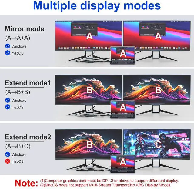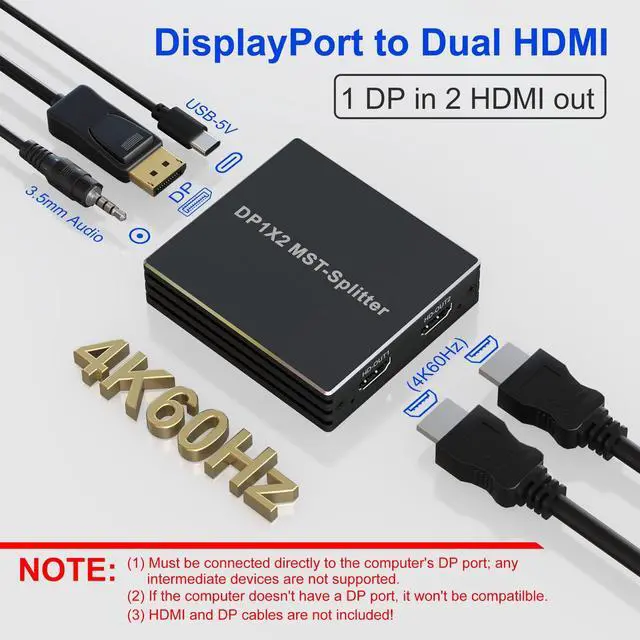HDMI Adapter: This DP to 2 HDMI splitter outputs one DisplayPort device source signal into two HDMI signals, allowing you to connect two monitors at once for work and play, with support for both SST mirrored mode and MST extended mode (MacOS only supports SST mode). Satisfy your need for more screen displays.