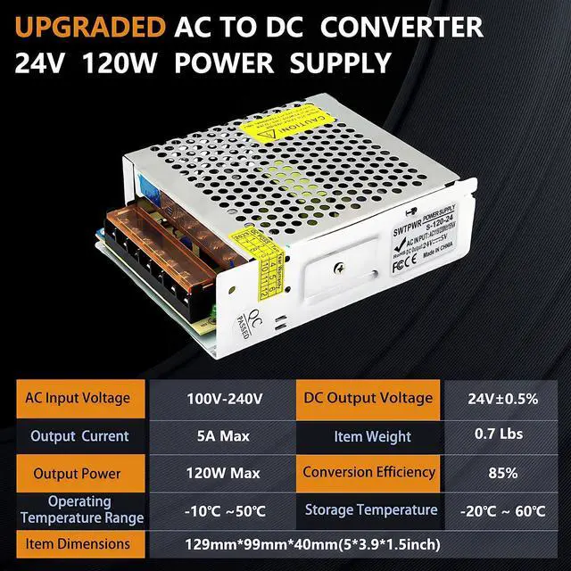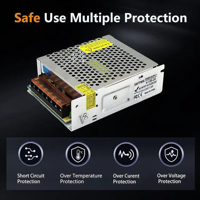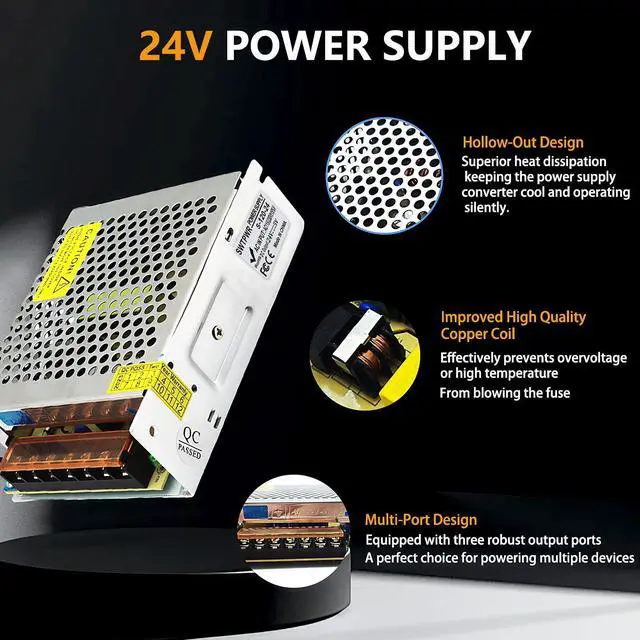 Premium 110V AC to 24V DC ConverterThis AC to DC Converter can work flexibly anywhere in the world with an input voltage of 110V or 220V. The output voltage can be regulated by 24V5%, from 22.8V to 25.2V, which greatly expand its application range. The rated power 120W, the maximum power used should not exceed 80% of the rated power of the product. ^^ High-Quality Components for Excellent performanceBuilt with oxygen-free coils/transformers, EMI filter capacitors, and premium chip designs, our converter guarantees stable power performance and reliable operation. Featuring multiple protection functions, including short-circuit, over-current, over-load, and over-temperature protection, it ensures excellent performance and safety, giving you peace of mind while using your 24V power supply.