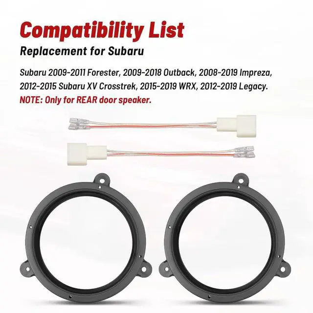 Fitment List: 6.5 inch rear door speaker adapter kit compatible with Subaru 2009-2011 Forester, 2009-2018 Outback, 2008-2019 Impreza, 2012-2015 Subaru XV Crosstrek, 2015-2019 WRX, 2012-2019 Legacy;
