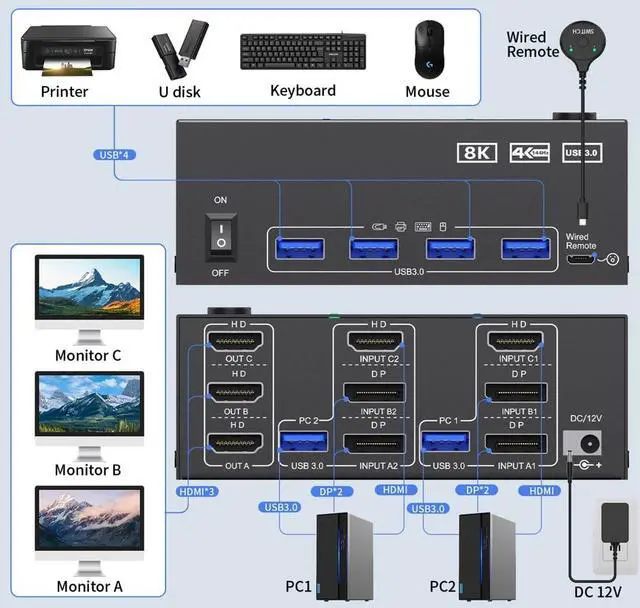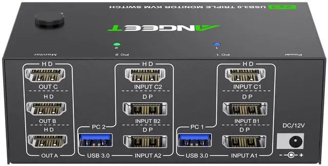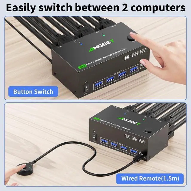 Note: Final resolution is also subject to graphic cards, monitors and cables. ^^ 3 Monitor KVM Switch with 4 USB 3.0 PortsHDMI Displayport KVM Switch equipped with 4 USB 3.0 port for connecting keyboard, mouse, printer, USB flash drive, etc. Supports ultra-high-speed 5Gbps data transmission, 10 times faster than USB 2.0 and downwards compatible with USB 2.0 / 1.1. ^^ Great compatibility & 2 switching modesANGEET KVM switch 3 monitors driver-free for Windows, Mac, Linux, Unix and Ubuntu. Support PC, Laptop, Raspberry Pi, DVR, NVR. it is widely applied for home, Office, Game, Meeting, etc.. You can press the button on the panel or use the wired remote (included) to switch the 2 computers. Two color LED indicate the active computer. ^^ Power Adapter and ON-OFF Switch DesignedThe upgraded 12V power adapter makes the KVM switch work smoother and provides more stable recognition when connecting high-power USB devices. When not in use, just turn off the KVM without unplugging the cables. ^^