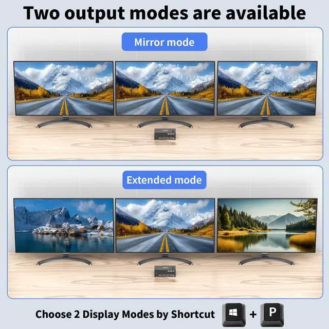 (monitors: 3 * HDMI, built-in DP to HDMI chip, no need to purchase DP to HDMI converter, making this triple monitor KVM switch run more smoothly and saving you extra costs. ^^ KVM Switch 3 Monitors 2 ComputersThis 3 Monitors KVM Switch perfect for hooking up 2 computers to share 4 USB 3.0 ports and 3 monitors (supports extended and mirrored display modes).: extended mode can output three different screens and mirror mode can output three identical screens. ^^ KVM Switch Triple Monitor Ultra HD 8KThe HDMI 2.1 and DP 1.4 Triple Monitor KVM Switches support resolution up to 8K@60Hz 4K@144Hz and downwards, makes the picture quality clearer and the details are displayed clearly and finely.