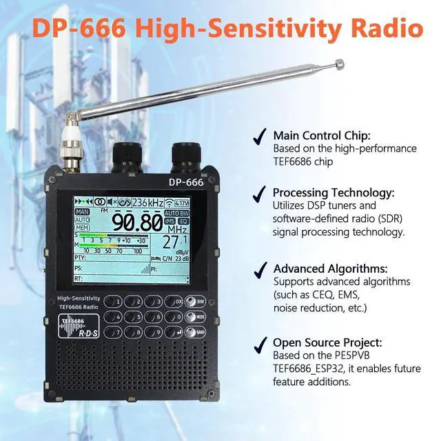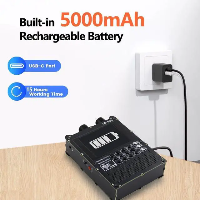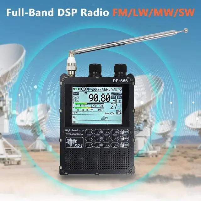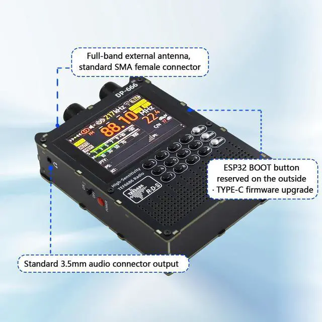 DP-666 2.8 -inch IPS touch screen full-band high-sensitivity DSP radio FM/LW/MW/SWBased on the high-performance TEF6686 chipFM/LW/MW/SW full-band DSP radio 2.8 -inch IPS full-view touch LCD screenDual-diaphragm large-cavity speaker5000mAh battery 3.5 mm headphone outputSupport the display of rich RDS informationOpen source codeThe firmware is upgradableTYPE-C port charging and firmware upgradeThe ESP32 BOOT button is reserved on the outside Built-in antennasShipping list1. Host2. SMA telescopic antenna3. Stylus3. TYPE-C data cable4. Storage bag5.