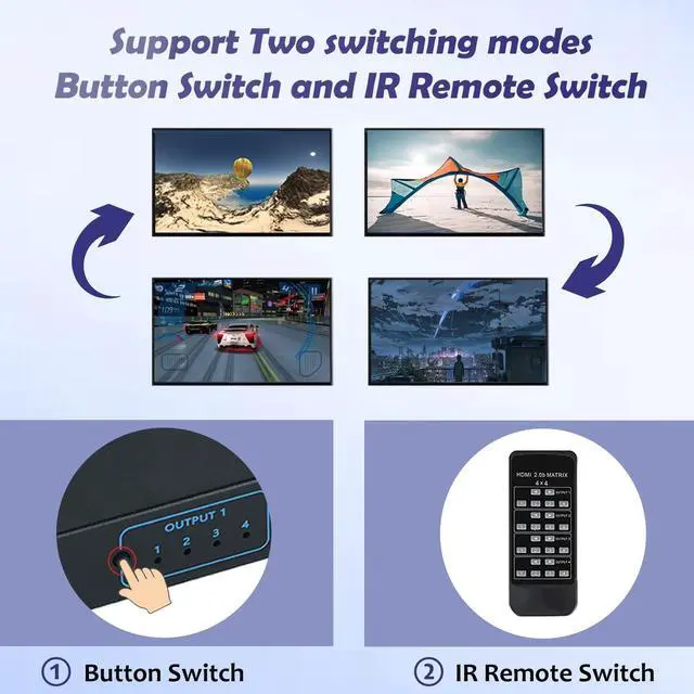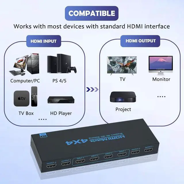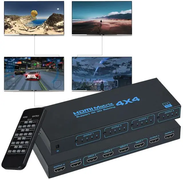 The HDMl matrix 4x4 can connect 4 HD signal sources to 4 HD display terminals. This HDMI Matrix Switch 4x4 allows four HDMl devices to be switched or split easily to four HDMl compatible monitors or projectors. This 4x4 HDMI Matrix Switch can be controlled by a IR remote control and a local button. When Switch by a local button or remote control, Please Wait about 5S time to let the choose signal show on the display. ^^ Support highest resolution up to 3840x2160@30Hz. It supports HDMI 1.4, HDCP 1.4, 3D.