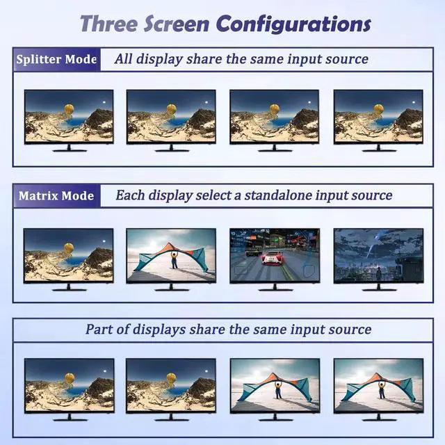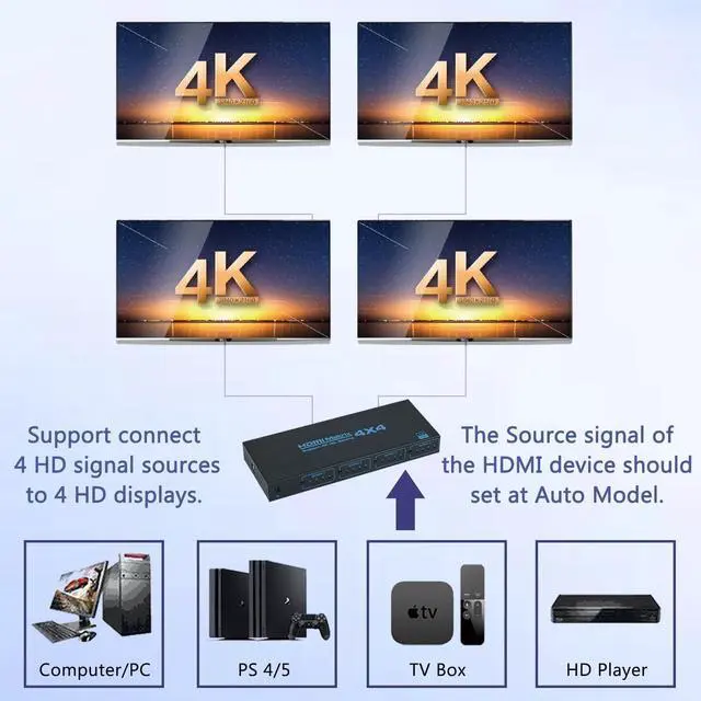 Please Note: When you want your display shows at 4K@30 resolution and HDR, Please make sure that our display connect to this HDMI Matrix should support 4K@30 resolution and HDMI. Other wise all display will shows the reolution depend on the lowest display! ^^