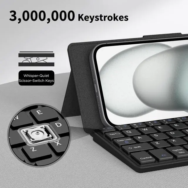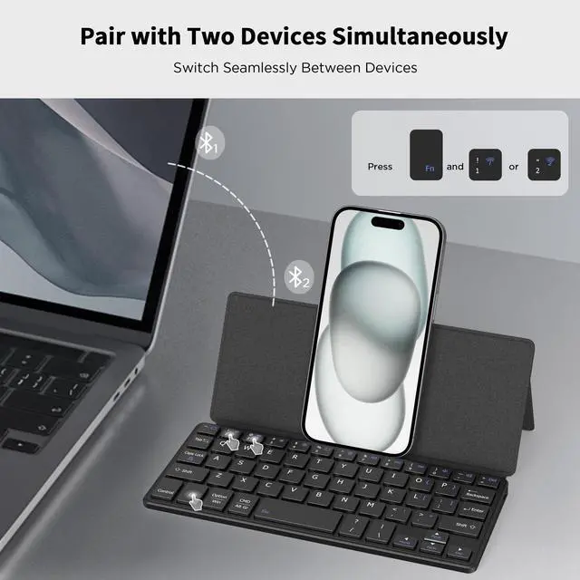 Wireless Foldable Keyboard with StandThis ultra-thin, portable, foldable keyboard weighs only 191 grams. When folded, the mini keyboard is only the size of a cell phone, light and portable, can be folded into a pocket or backpack and taken with you ^^ Wireless Connection, 2 Wireless ChannelsThe wireless keyboard has a stable connection and strong compatibility. 2 Wireless channels can be switched seamlessly between 2 devices, and the foldable keyboard can connect seamlessly to cell phones, tablets, laptops and PCs within a connection distance of 10m ^^ Multi-system compatibilityThe foldable keyboard is widely compatible with iOS, Android and Windows operating systems, the foldable keyboard is suitable for iPhone, Samsung, laptops, desktop computers and more devices, please refer to the product description for specific connection methods ^^ Foldable QWERTY mobile phone keyboardThis Wireless mini foldable QWERTYmobile phone keyboard uses a wallet style with adjustable stand for flexible viewing angles.