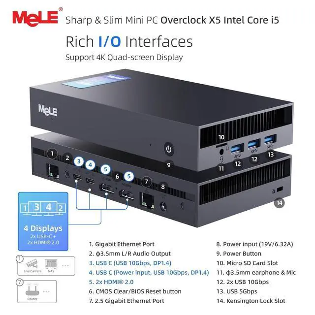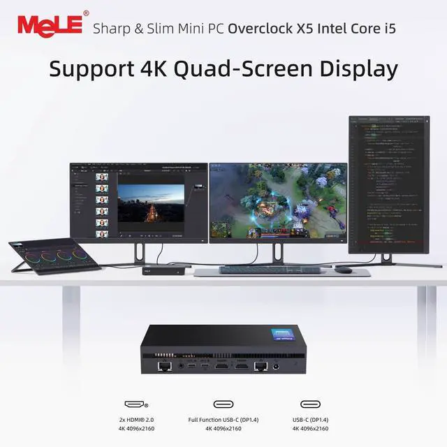Further storage expansion is enabled through an M. 2 2280 SATA interface supporting up to 2TB additional capacity. This powerhouse enables seamless multitasking and rapid data access. ^^ Quad Display & Versatile Connectivity- Measuring just 18010331mm ( 0.57L ), the MeLE Overclock X5 packs quad 4K display outputs into its compact chassis. Engineered for professionals, it boasts dual HDMI 2.0, dual USB-C 10Gbps, dual USB-A 10Gbps, dual 3.5 mm audio jacks, a Micro SDXC card reader, and dual Ethernet ports (1GbE + 2.5G bE). This ultra-compact powerhouse delivers professional-grade expansion for multi-screen office setups, digital signage, surveillance systems, and beyond.