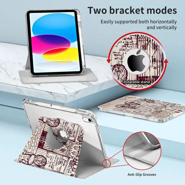 Full Protection Crafted with premium PU leather and soft TPU, this 2022 iPad 10th Gen 10.9 -inch case resists stains and scratches. HD printing ensures long-lasting color vibrancy without fading. ^^ Auto Sleep/Wake Built-in magnets activate smart sleep/wake functionality. Automatically saves battery life by turning the screen on/off when opening/closing the case. ^^ 360 Rotating Stand Adjust viewing angles effortlessly with the rotating stand. Securely holds your iPad in portrait or landscape mode for typing, streaming, or video calls. ^^ Multiple Styles Available Choose from sleek modern designs, vintage classics, or playful cartoon patterns to match your personal style.