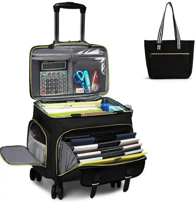 Extra-large space: The size of the rolling teacher bag is 15.5 *12* 8.5 inches. The maximum size of the foldable rolling pull rod is 37.7 inches. There is a main space with a base plate inside. There is a compartment for laptops and tablets. There are 2 zipper transparent bags and mesh bags on both sides. There is one mesh bag, a water cup bag and a magnetic portable pocket on the outside ^^