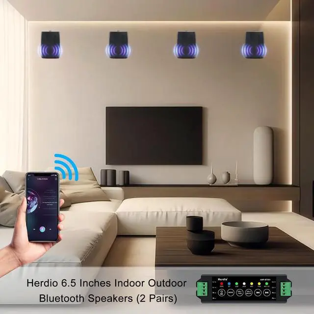 The Bluetooth speaker system with amplifier supporting connection to 4 speakers and supports AUX, USB, MIC, TWS, also allows the phone to be controlled from its location, raising volume, changing songs etc. The speaker DOES NOT have Bluetooth connectivity, they are individually WIRED to the Bluetooth amplifier which offers true stereo sound without special linkable individual Bluetooth speakers. ^^ Easy to MountWe designed easy install swivel brackets to make sure you are able to place all the outdoor speakers in optimal height. This bracket allows a swivel range of 90-120 degrees.
