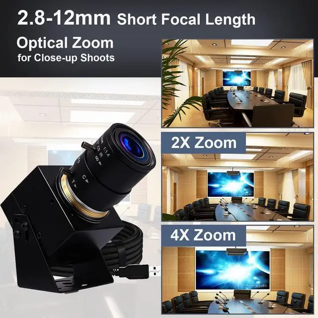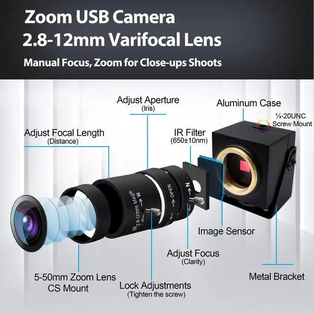Zoom lens: USB Camera with CS mount 2.8 mm-12mm manual lens, short focal length for close ups and wide angle shoots. Give creative controls for focal length, aperture and clarity, ideal for video streaming, online class and 3D printer monitoring ^^ Plug and Play