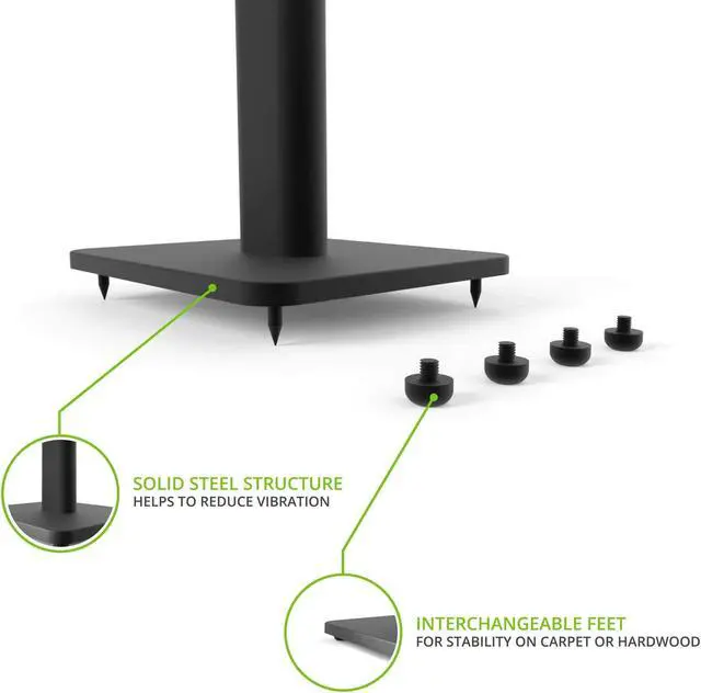 INTERCHANGEABLE FEET - Spiked feet are provided to keep the stands securely planted on carpet. To avoid damage to hardwood flooring, domed rubber feet are also included.