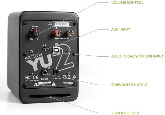 YU2 is ready to set up right out of the box with included power cord, speaker wires, 3.5 mm mini-jack audio cord, and a USB cable to connect the speakers to your computer