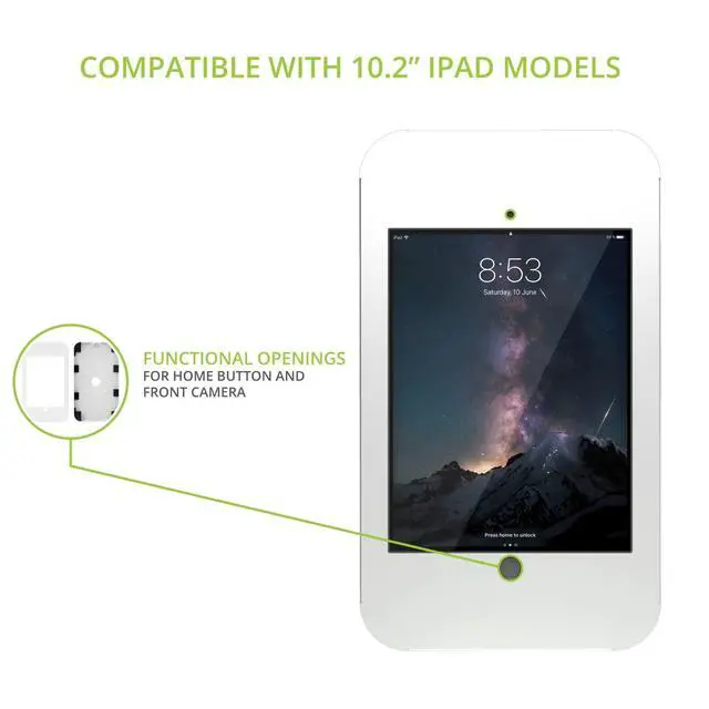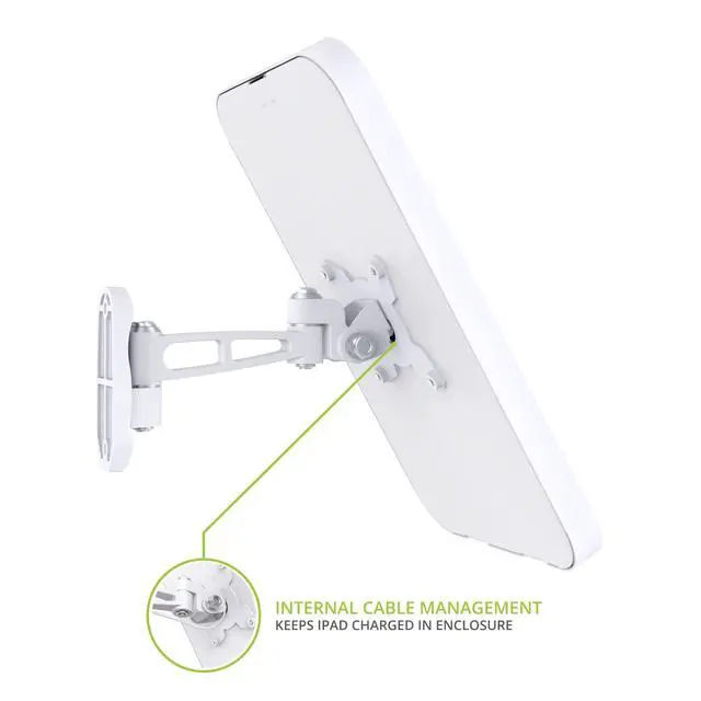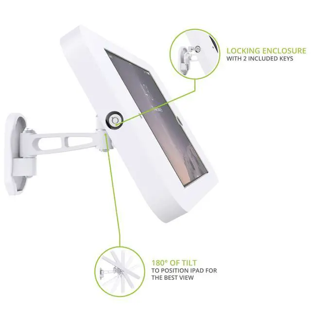 LOCKING ENCLOSURE You can have peace of mind knowing your investment is safely locked. When you're ready to remove the iPad, you can easily do so with one of the 2 included locking keys. ^^ WALL-MOUNTING Bolting the stand to the wall provides you with extra security from theft ^^ CABLE MANAGEMENT Make sure your device is always charged and the cable is snag free by keeping the cable within the arm of the stand. ^^ ADJUSTABLE The fully-articulating arm allows you to swivel the iPad 90 degrees right or left. You can also tilt and rotate the screen to the most optimal viewing position.