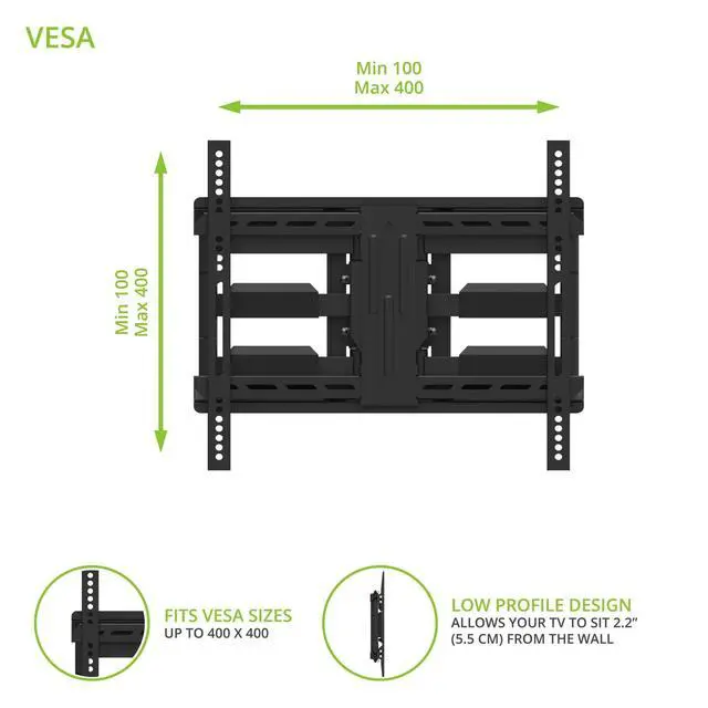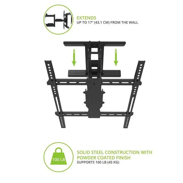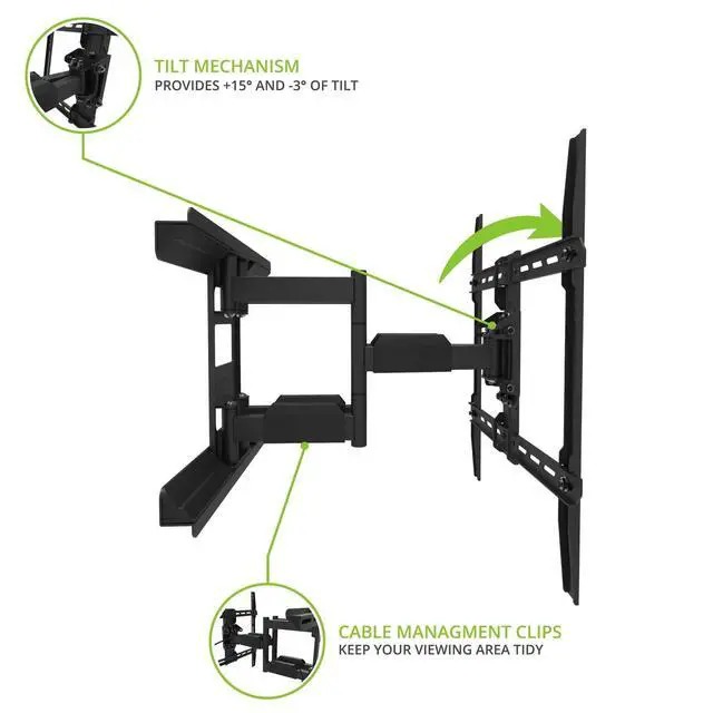 EASY INSTALLATION - Capable of supporting up to 100 lb., the LDX640 can be mounted to any concrete wall or wood studs up to 16 apart. ^^ IMPROVED VIEWING - Heavy-duty articulating arms allow you to swivel your TV 45 in either direction and tilt it -3 to +15 to achieve the best viewing angle. ^^ LOW-PROFILE DESIGN - The low-profile design of the LDX640 allows your TV to sit 2.2 from the wall when fully retracted. ^^ CLEAN SETUP - Cable management clips are provided to conveniently route your cables, while plastic wall plate covers hide any sign of installation.