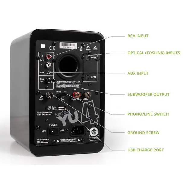 4" Kevlar drivers and 1" Silk dome tweeters deliver crisp highs and wonderfully balanced mid-range ^^ Integrated Bluetooth with Qualcomm aptX technology lets you enjoy high-quality streaming from the palm of your hand ^^ Equipped with a built-in phono preamp, Yu4 can be easily connected to any vintage or modern day Turntable ^^ Includes a remote to give you full control over your Audio ^^ Each speaker measures 5. 5" W x 7. 5" D x 8. 7" H (14 x 19 x 22 cm)