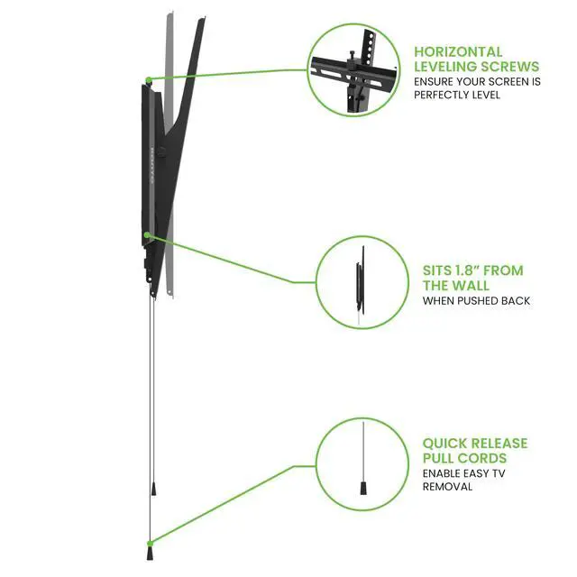 HEAVY-DUTY SUPPORT Designed for extra-large TVs, T300 supports up to 150 lbs and VESA patterns up to 800x600. Whether youre upgrading your home theater or mounting an interactive display in a conference room, T300 is up to the task. ^^ HASSLE-FREE INSTALLATION Quick-release arms make securing or removing your TV effortless, perfect for servicing or upgrades. The open-frame design accommodates outlets and simplifies cable management, keeping your setup clean and organized. ^^ PERFECT ALIGNMENT Level adjustments and horizontal shift ensure precise TV positioning, even when your studs arent in the ideal location.
