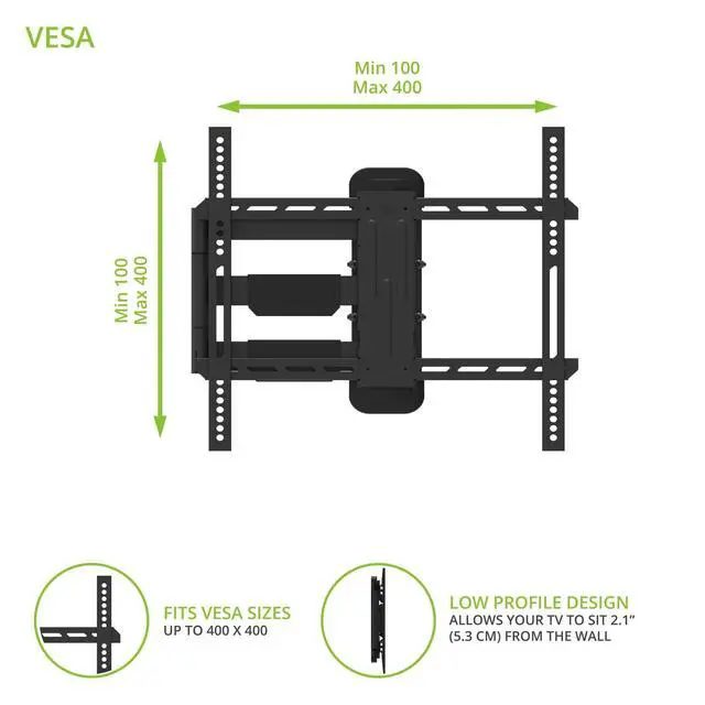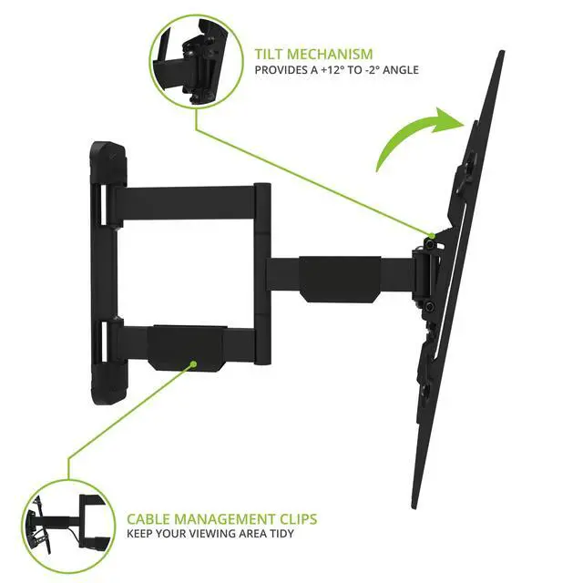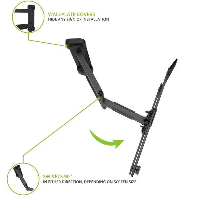 • FULL MOTION DESIGN - The articulating support arm lets you extend your TV up to 19.5 inches from the wall and swivel it 90 degrees in either direction. Maintain a perfect viewing angle wherever youre seated.