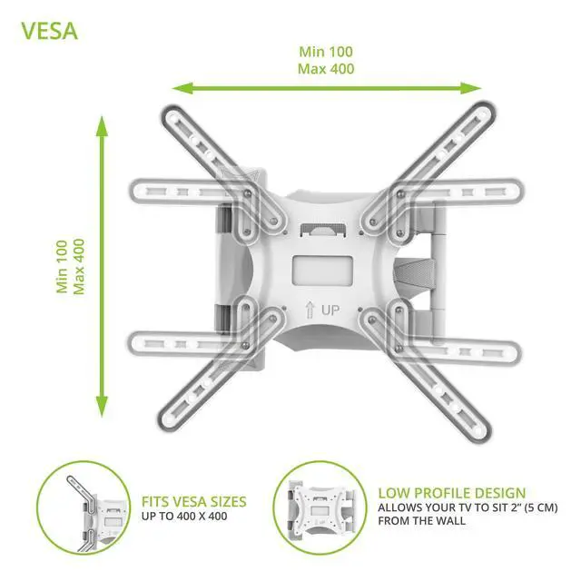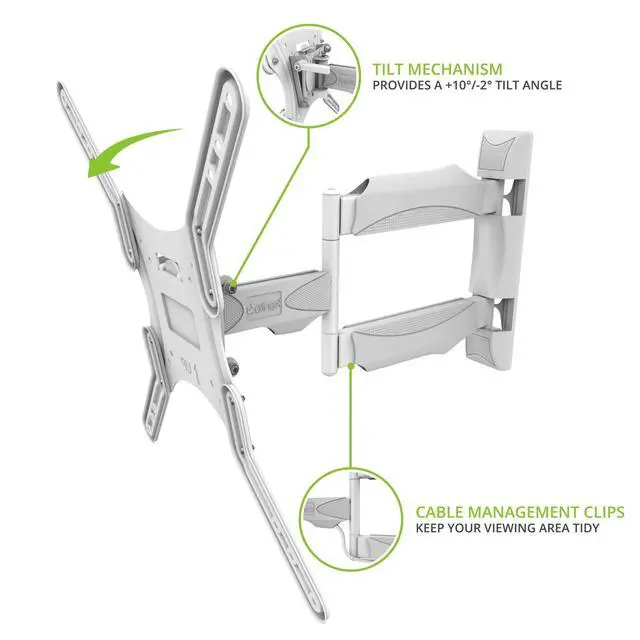 NOTE: Your TV will sit 5" to the left or right of the wall plate when fully pushed back. ^^ HEAVY-DUTY CONSTRUCTION Featuring solid steel construction, this heavy-duty articulating television mount can safely support up to 80 pounds, even at full extension. Mount your 26 to 55-inch flat screen TV with confidence while enjoying all the flexibility the M300W has to offer. ^^ ENHANCED LIVING SPACE Enhance the aesthetic of any household or professional space by freeing up floor area. The M300W's minimalist design gives you a spacious and non-crowded living space, while its long-lasting powder coat finish looks great against any wall or surface. Detachable cable management clips are also provided, allowing you to route your power and video cables neatly from the TV back to the wall. No tools are needed in order to tuck your cables out of sight. ^^ MAXIMUM SUPPORT With the addition of four TV bracket extension arms, the M300W is designed to support TVs with
