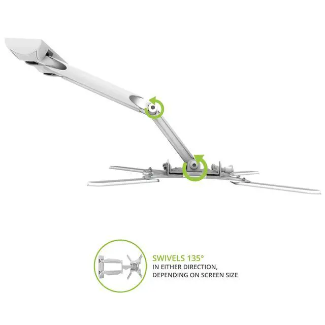 FULL MOTION FUNCTIONALITY The M300W Full Motion Television Wall Mount offers a wide range of functionality to maximize your television's capabilities and accommodate your life at home. Its articulating arm allows you to extend your TV 19.6" from the wall, swivel it up to 135 left or right (depending on screen size), and tilt it +10 to -2 to achieve an optimal viewing angle. The tilt mechanism is easily accessible and uses a spring-loaded lever system that requires zero tools. ^^ EASY SETUP Along with mounting hardware for wood stud and concrete walls, the M300W includes a wide selection of bolt and spacer sizes to ensure a proper fit with your TV.