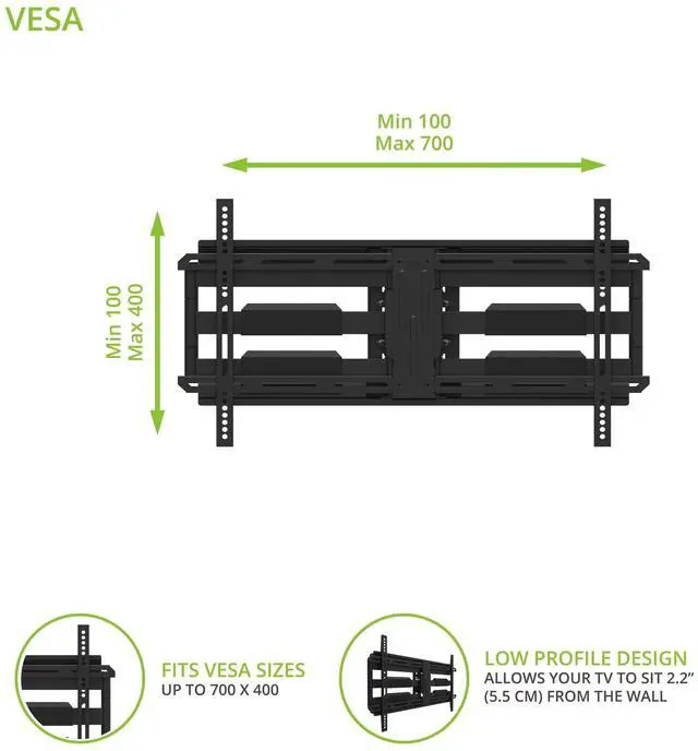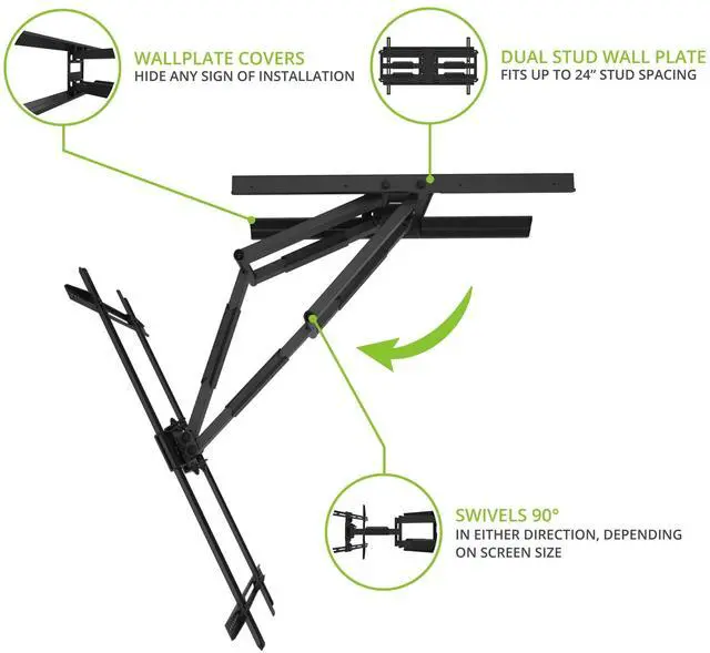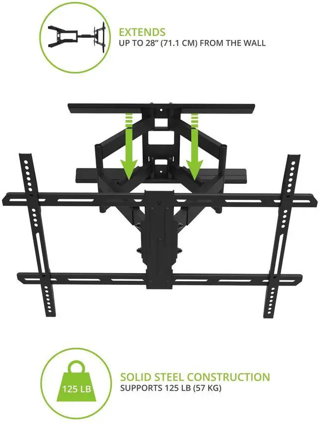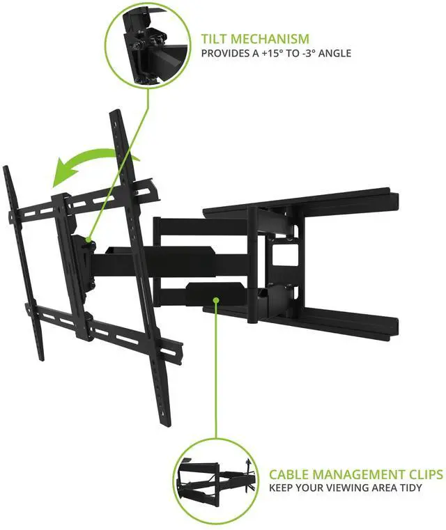 FULL MOTION DESIGN - Heavy-duty articulating arms allow you to extend your TV 28" from the wall and swivel it 80 in either direction. Maintain a perfect viewing angle wherever youre seated. ^^ IMPROVED LINE-OF-SIGHT - Achieve between +15 to -3 of tilt in order to reduce glare and improve line-of-sight when mounting your TV above eye-level. The tilt head can be easily tensioned to allow for on-the-fly adjustments or to lock your TV in place. ^^ HASSLE-FREE INSTALLATION - Use the provided drill template to accurately mount your TV on brick, concrete or wood studs up to 24" apart.