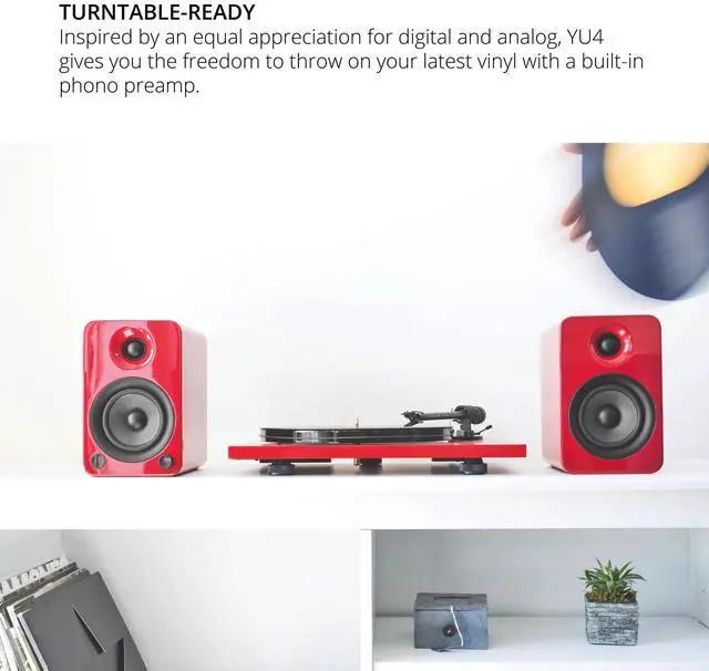 Remarkable sound - enclosed in Handcrafted MDF cabinets measuring 8. 7" Tall, yu4's 1" Silk dome tweeters and 4" Kevlar drivers deliver crisp highs and wonderfully balanced mid-range, faithfully reproducing all your favorite tunes. ^^ Easy streaming - Built-in Bluetooth with Qualcomm aptX technology lets you enjoy high-quality streaming from the palm of your hand. ^^ Vinyl-ready - equipped with an integrated phono preamp, Yu4 can be easily connected to any vintage or modern day Turntable. ^^ Signal detection - Yu4 features automatic standby and power-up modes, helping to conserve power when you're gone and ensuring you never miss a beat when the music starts playing.