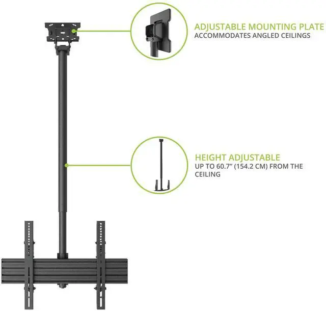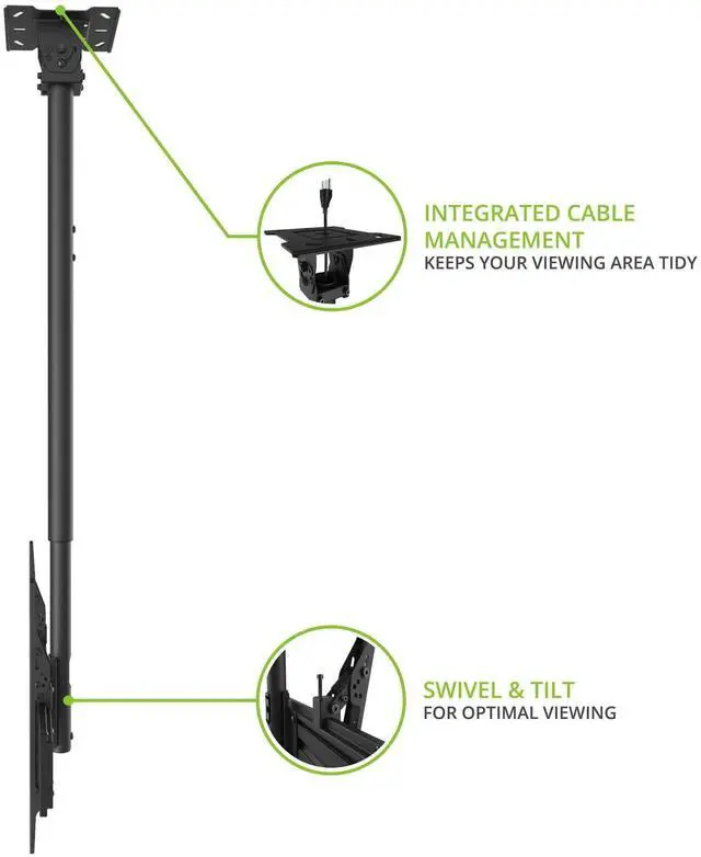 HASSLE-FREE INSTALLATION - To make mounting your TV as easy as possible, the CM600's ceiling mounting bracket comes detached from the rest of the mount, allowing it to be installed independently to any wood stud or concrete ceiling. Simply slide the telescoping extension pole into place to complete the installation. ^^ ANGLED CEILINGS - To accommodate sloped ceilings and support beams, swing the extension pole up to 90 degrees and lock it in place at the preferred angle. This also allows the CM600 to be installed on a wall, if needed. ^^ ADJUSTABLE HEIGHT - Ensure your 37 to 70 inch TV is hanging at an ideal height by extending the telescoping pole from 42.7 to 66.3 inches.