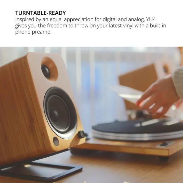 4 Kevlar drivers and 1 silk dome tweeters deliver crisp highs and wonderfully balanced mid-range ^^ Integrated Bluetooth with Qualcomm aptX technology lets you enjoy high-quality streaming from the palm of your hand ^^ Equipped with a built-in phono preamp, Yu4 can be easily connected to any vintage or modern day Turntable ^^ Includes a remote to give you full control over your Audio ^^ Each speaker measures 5. 5" W x 7. 5" D x 8. 7" H (14 x 19 x 22 cm)