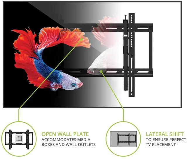 ^^ PERFECT PLACEMENT: Nail your TVs placement with oversized TV brackets that let you adjust your TV vertically and a wide wall plate for horizontal adjustment. Post installation leveling is included for a professional looking finished result.