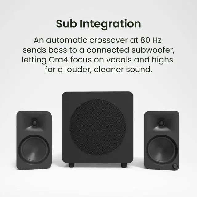 ^^ MODERN CONNECTIONS To cover your digital and analog needs, ORA4 offers three inputs - USB-C for flawless sound from your PC or Mac, Bluetooth 5.0 for pairing with your phone or smart home device, and RCA for your analog gear. An endless amount of audio sources work with ORA4 from the past, present, or future. ^^ TIGHT SUB INTEGRATION You dont have to sacrifice fidelity for low-end grunt. When a subwoofer is connected, a crossover network activates automatically, allowing ORA4 to concentrate on vocals and high frequencies. By offloading bass, ORA4 can play louder with less distortion improving overall sound quality.