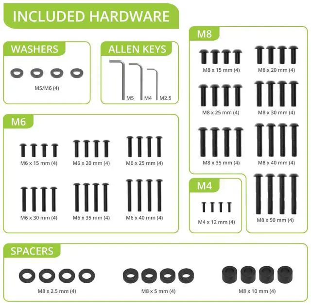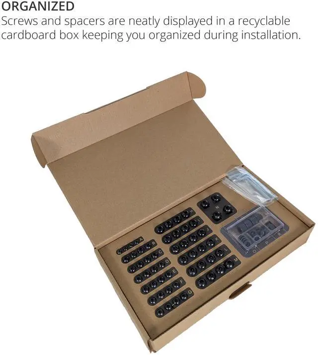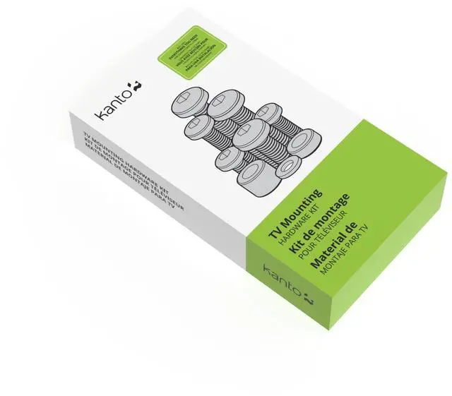 BOLT-KIT includes all the bolts, spacers, and washers needed to attach a TV to a mount. This universal TV screw kit simplifies installation by providing a variety of TV bolt sizes to ensure compatibility with nearly any TV. Neatly organized in a fully recyclable cardboard box, BOLT-KIT cuts down on waste and allows you to reuse your existing TV mount keeping. BOLT-KIT is a sustainable solution that eliminates the hassle of having to source the correct hardware for your screen and TV mount.