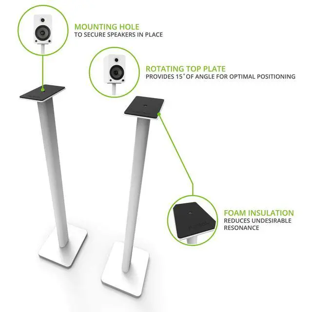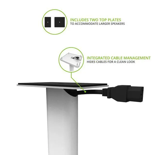 ROTATING TOP-PLATE - Adjust the position of the top plate to ensure your speakers are always angled towards you. ^^ IMPROVED SOUND QUALITY - Foam padding and heavy-duty steel help to reduce vibration and improve overall sound quality. ^^ MAXIMUM STABILITY - 7-inch and 4-inch wide top plates are provided to accommodate different size speakers. Each plate features a mounting hole and 1/4 - 20 screw to secure YU4, YU6 or other compatible speakers in place. ^^ CABLE MANAGEMENT - Conceal your power cable and speaker wire by routing them through the stands center column.