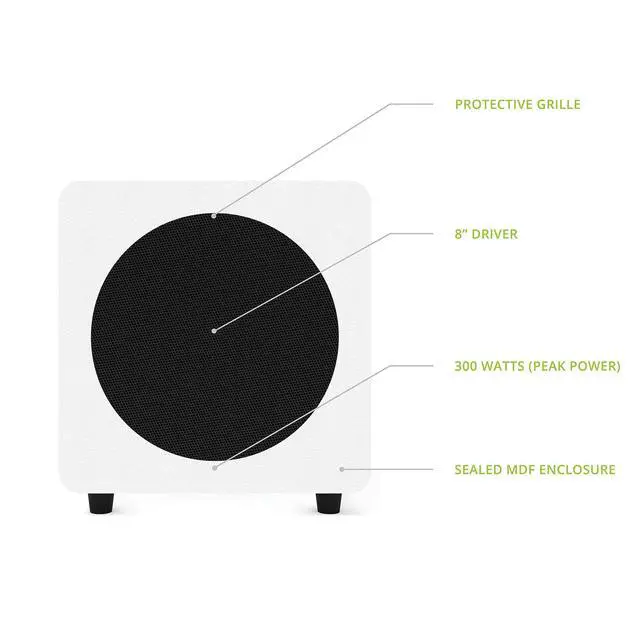 SEALED ENCLOSURE - Sealed subwoofers react to changes in audio more quickly than vented designs. Every bass note is reproduced accurately with little distortion allowing you to hear pure audio and not the subwoofers influence on the sound. ^^ COMPACT DESIGN At roughly 11 in each direction, sub8 fits under desks or in the smallest of apartments where traditional home theatre subwoofers may dominate the space. ^^ DURABLE MATERIALS All materials used are designed for years of worry-free longevity. Never worry about moving or placing items on sub8 as it can take the rigors of everyday life.