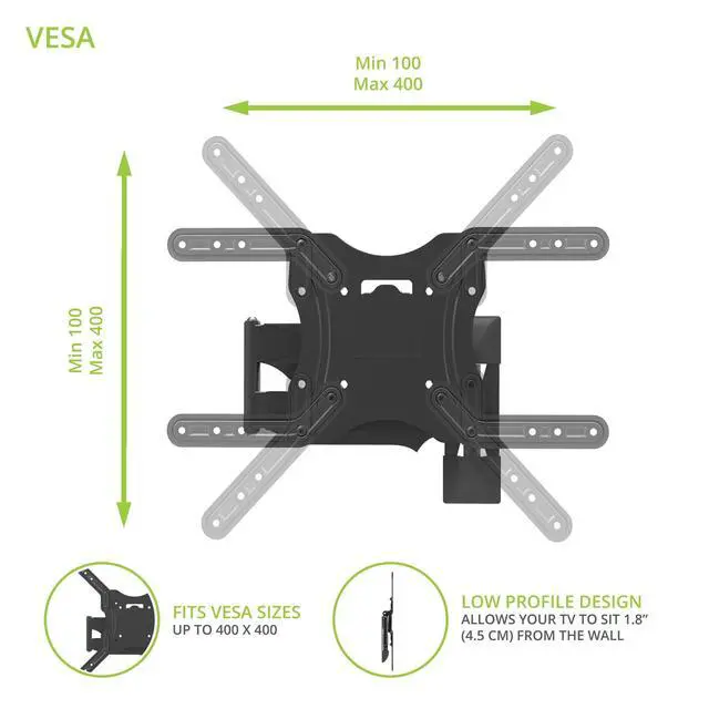 The Kanto M200 single-stud TV mount allows you to achieve a wide range of viewing angles without taking up a large amount of wall space. Providing 18.6 inches of extension, its articulating support arm provides easy swivel, pan and tilt adjustments to improve line-of-sight with your TV. The arm can also be pushed back to place your TV 1.8 from the wall, with the center of the screen sitting 3.9 inches to the left or right of the wall TV mounting plate. Featuring snap-on cable management clips and wall plate covers, this pan and tilt mount provides a clean and low-profile solution to your TV mounting needs.