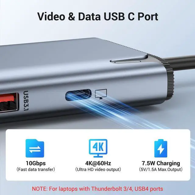 Intel JHL8140 Multiport USB C HUB USB C to USB C hub equipped Intel JHL8140 Chip,a USB C video out port has three functions:: 4K@60Hz video output + 10Gbps data transfer + 7.5W charging.So it's not as bulky as other products and can be easier and faster for you to use (For laptops equipped with a USB-C port and supporting Thunderbolt 3/4 or USB4,and the monitor must support USB C Alt mode).
