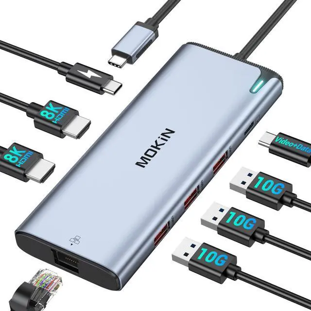 8K Dual HDMI Display PortThis MOKiN USB C multiport adapter with 8 ports, 3 monitors display port: 2 x 8K@60Hz HDMI Ports and 1 x 4K@60Hz USB C video output. 3 x 10Gbps USB-C 3.1 ports,1 x 100W PD charging port and 1 x 1000Mbps Ethernet port.This is a usb c hub for laptop with powerful functions.