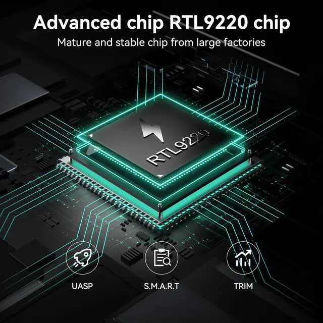 Stable & Mature Chip: The nvme ssd enclosure is equipped with a mature and stable RTL9220 controller chip architecture.Excellent temperature control. When used in conjunction with tool free aluminum casing, it ensures the security and stability of efficient data transmission, helping