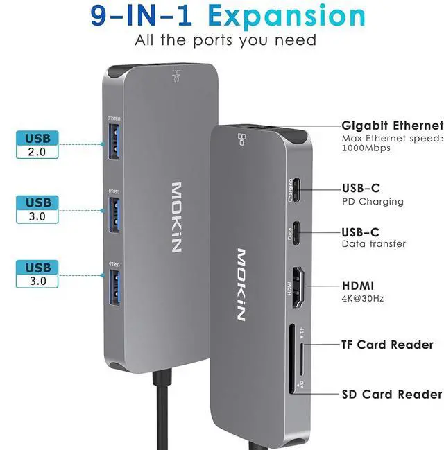 Ethernet Port: MOKiN multiport adapter built in SD and TF slots easily access files from universal SD card and Micro SD card. apple computer adapter support 2 cards reading simultaneously. USB C to RJ45 ethernet port ensures a stable and faster wired internet connection which is up to 1 Gbps.