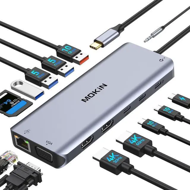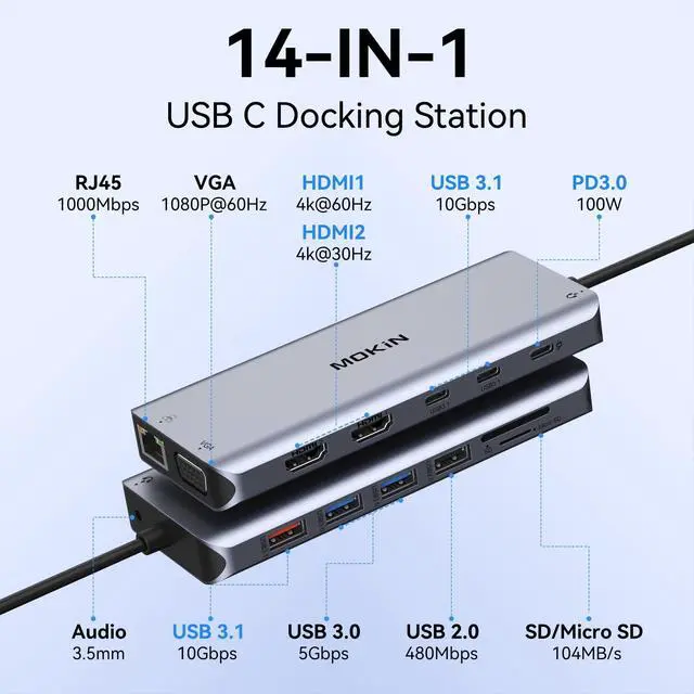 MOKiN Docking Station: This docking station dual monitor, 2 HDMI, VGA, Gigabit Ethernet, 1 USB 3.1, 2 USB 3.0 and 1 USB 2.0 ports, USB C power charging port (max. 100W), SD/Micro SD card reader, and 3.5 mm microphone/audio. In addition, this docking station 2 HDMI does not require any driver installation and is plug-and-play for your daily use ^^ 3 Display and 4K