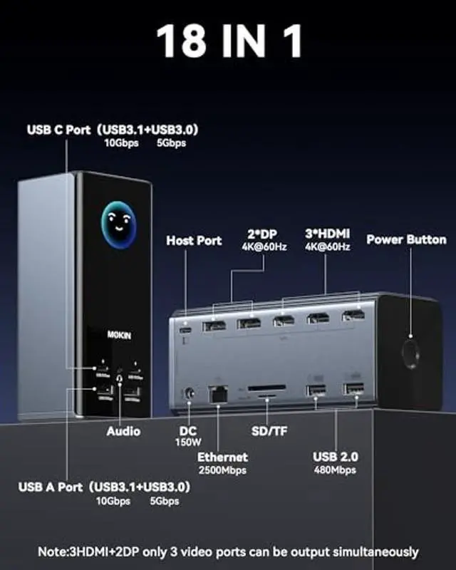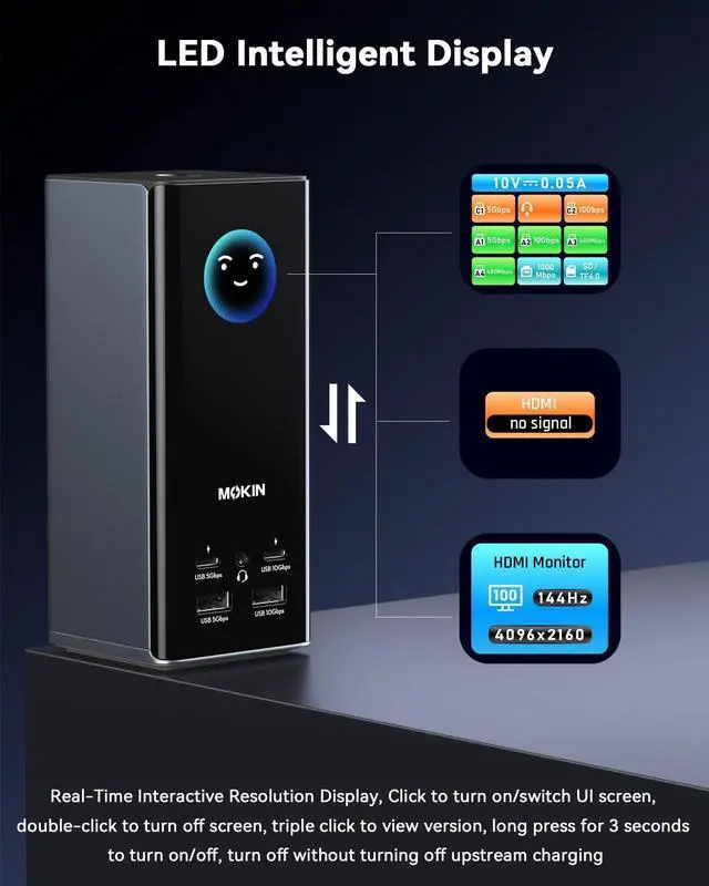 ^^ Data Transmission 10Gbps: This usb c docking station achieves up to 10Gbps data transmission speed with its USB 3.1 Gen 2 ports (2 USB-C and 1 USB-A), enabling you to transfer 20GB files in just 20 seconds. MOKiN docking station ensures a fast and secure transfer experience. ^^ Innovative Upright Design & Screen-lock Button: Smart LCD docking station compact vertical laptop docking station with sleek aluminium finish, 80cm cable and a magnetic base, redefine your workspace. Vertical expansion space provides a larger usage range for your desktop. The built-in LCD digital screen displays the connection status of each port. Use the screen-lock button to secure sensitive information whenever needed.