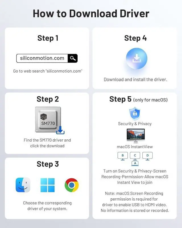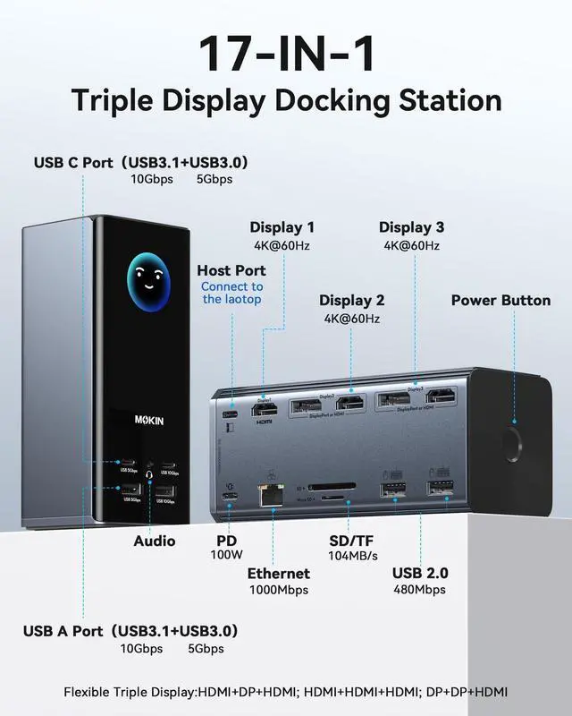 Dock]: Flexibly combine 3 HDMI ports + 2 DP ports to simultaneously extend three displays on Windows/macOS/Linux systems. This product solves the issue that macOS does not natively support triple-screen displays, delivering 4K@60Hz video quality regardless of port configuration.
