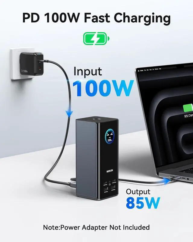 Fast Charging]: The USB-C PD port supports up to 100W power input, enabling up to 85W pass-through charging for laptops. We recommend connecting a 65W or higher adapter; use a 100W adapter when the device is under full load.