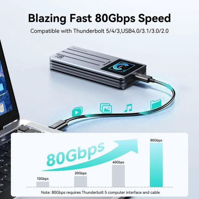 Ultra-Fast 80Gbps Transfer Speed Featuring the advanced Intel JHL9480+RTL9210B chipset, this NVMe M. 2 SSD Enclosure delivers a maximum transmission rate is 80Gbpsdoubling the speed of Thunderbolt 4/USB4. Achieve blazing-fast file transfers and seamless performance in 8K video editing, large-scale backups, and data-intensive tasks.