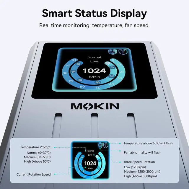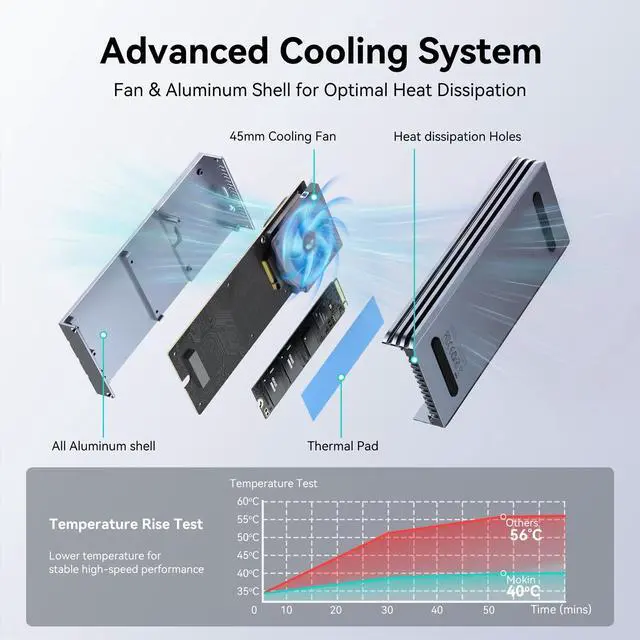 Note: 80Gbps requires Thunderbolt 5 computer interface and cable. Transfer speeds may vary depending on cables, devices, and SSD models ^^ Smart Status DisplayThe m. 2 nvme ssd enclosure features a dynamic screen that provides real-time, at-a-glance monitoring of its health. It shows crucial metrics like temperature (Normal/Medium/High) and active fan speed to ensure optimal performance. Clear prompt icons intuitively remind you of fan abnormalities or overheating issues, ensuring peace of mind during intensive transfers ^^ Active Cooling Silent FanEquipped with a smart cooling fan and an aluminum heatsink enclosure, this 80Gbps NVMe Enclosure actively prevents thermal throttling to maintain peak SSD performance. Engineered for virtually silent fan operation. The fan intelligently auto-activates at high temperatures and switches off when cooled, ensuring optimal stability and extending your drive's lifespan during intensive data transfers ^^ Universal CompatibilityMOKiN 80Gbps SSD Enclosure delivers top-tier performance and is universally compatible with Thunderbolt 5/4/3 and USB4/ 3.2 / 3.1 / 3.0 / 2.0 ports on modern Mac (M1/M2/M3/M4 series) and Windows PCs.