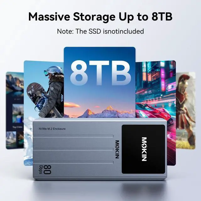 Note: To achieve the maximum 80Gbps speed, ensure your host device, cable, and port all support the same high-speed standard ^^ 8TB Capacity SupportSpecifically designed for high-capacity NVMe M. 2 SSDs, supporting 2280/2260/2242/2230 form factors with capacities up to 8TB. Perfect for expanding storage for pro-grade media libraries, game collections, or project archives.
