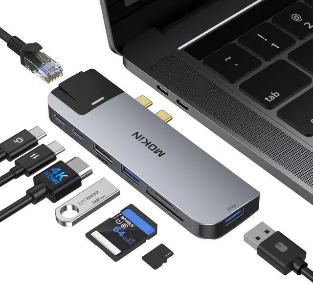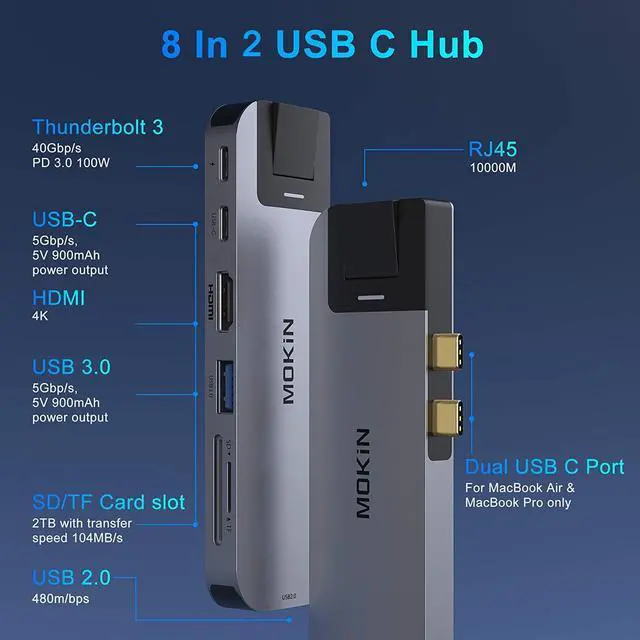USB C HUB 8 in 2 expand your MacBook Pro ports into 1*USB 3.0 +1*USB 2.0 +HDMI+1*Thunderbolt 3 +1*USB C Data+Gigabit ethernet and SD/TF card reader. Meet all your needs with one hub. Perfect companion for your MacBook Pro 13" and 15" 2019/2018/ 2016/2017.