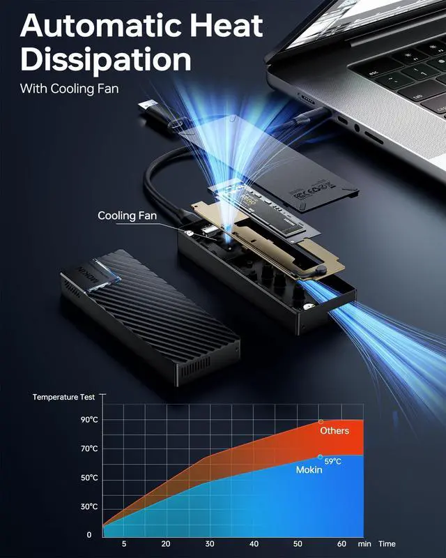 40Gbps M. 2 NVMe Enclosure40Gbps M. 2 SSD enclosure boasts cutting-edge technology, built-in advanced ASM2464PD chip with short-circuit and over-current protection, providing users with exceptional data transfer speeds, fully compatible with Thunderbolt 4/3, M. 2 enclosure supports USB4/USB 3.2 / 3.1 / 3.0 / 2.0 ^^ Excellent Heat DissipationThis M. 2 NVMe SSD enclosure has a built-in small cooling fan and aluminum alloy shell for enhanced heat dissipation. While the integrated cooling mechanisms prevent thermal throttling, SSD enclosure with cooling fan maintains optimal performance even during prolonged usage ^^ Tool-free and Portable100% tool-free, no screw or screwdriver is required.